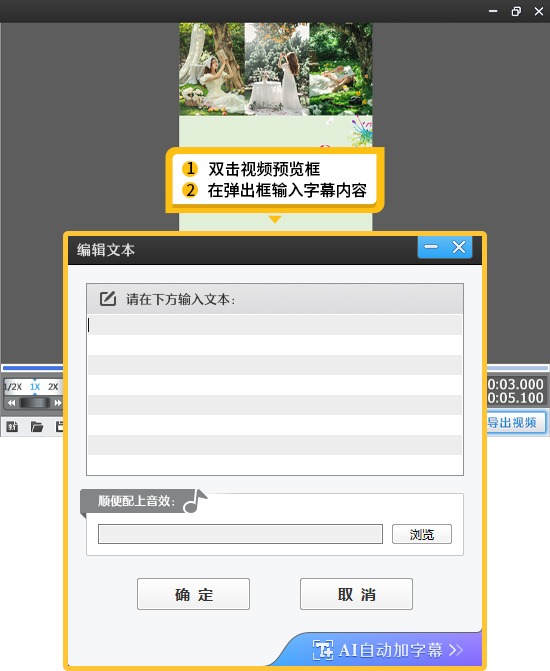 添加标题字幕:点击顶部导航条“字幕特效”,双击视频预览框,在中间输入好看的标题字幕即可。